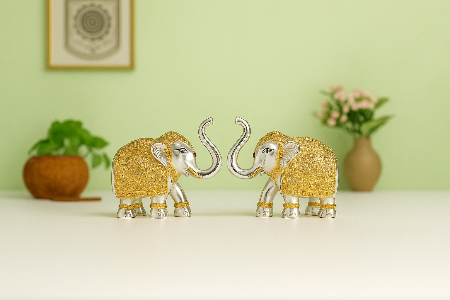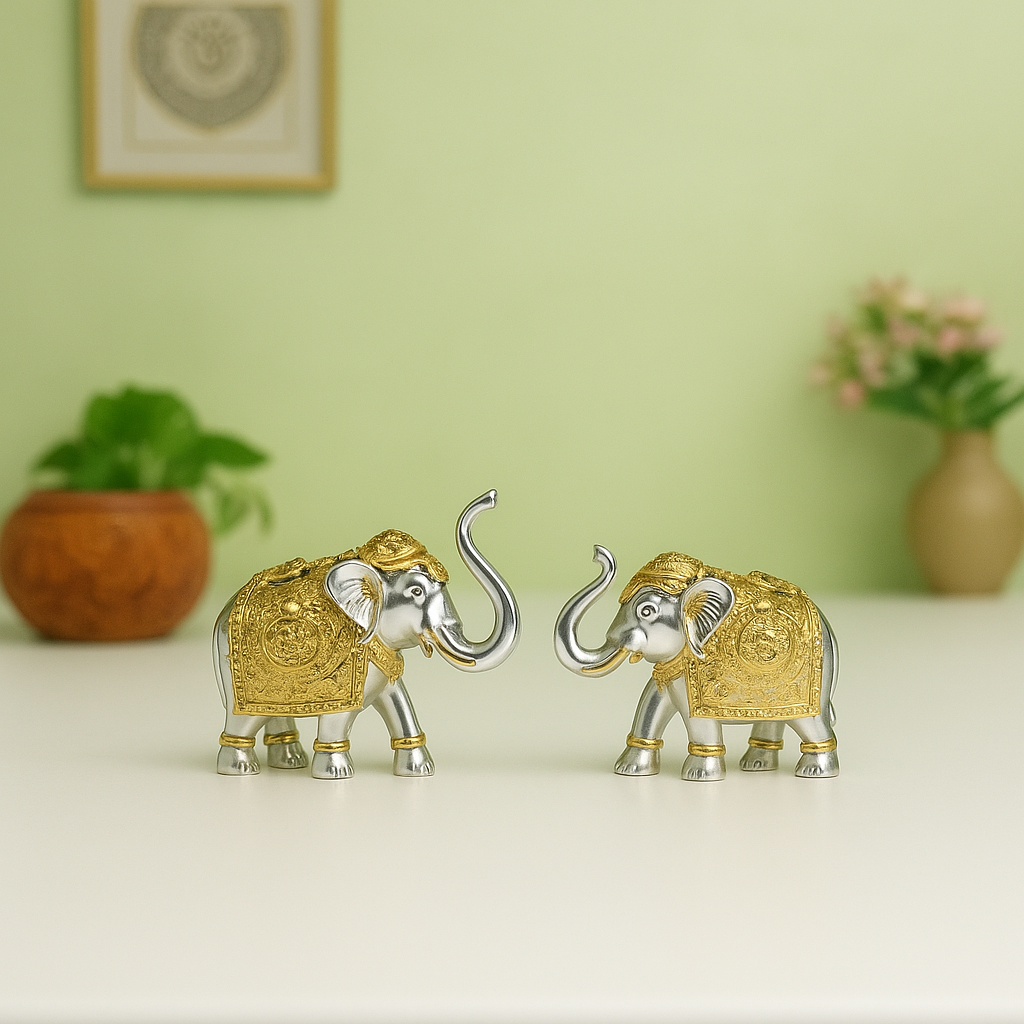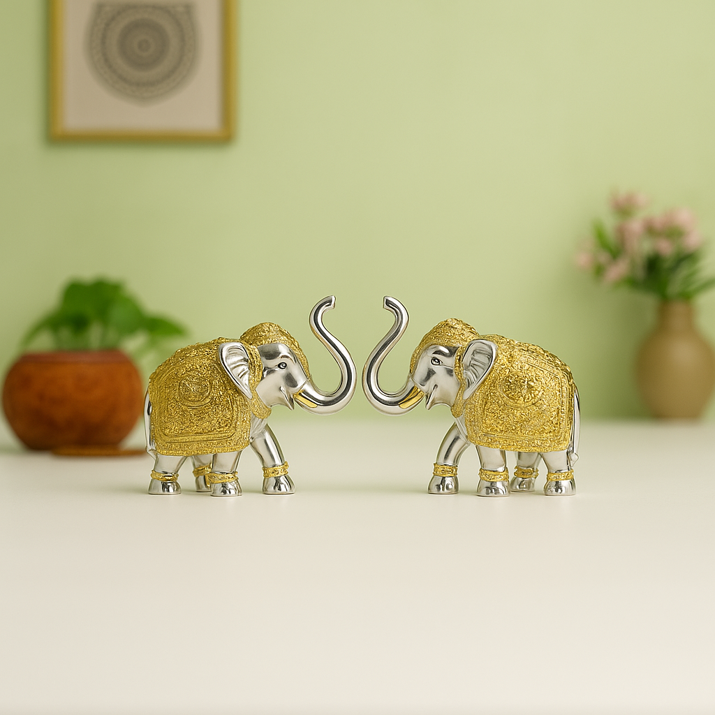 This decorative set features a matching pair of Elephant figurines, symbolizing strength, wisdom, good fortune, and stability. These elephants are rendered in a luxurious dual-tone finish, combining a bright, glossy silver-plated body with ornate golden accents on the trimmings, saddle, or headpiece.
