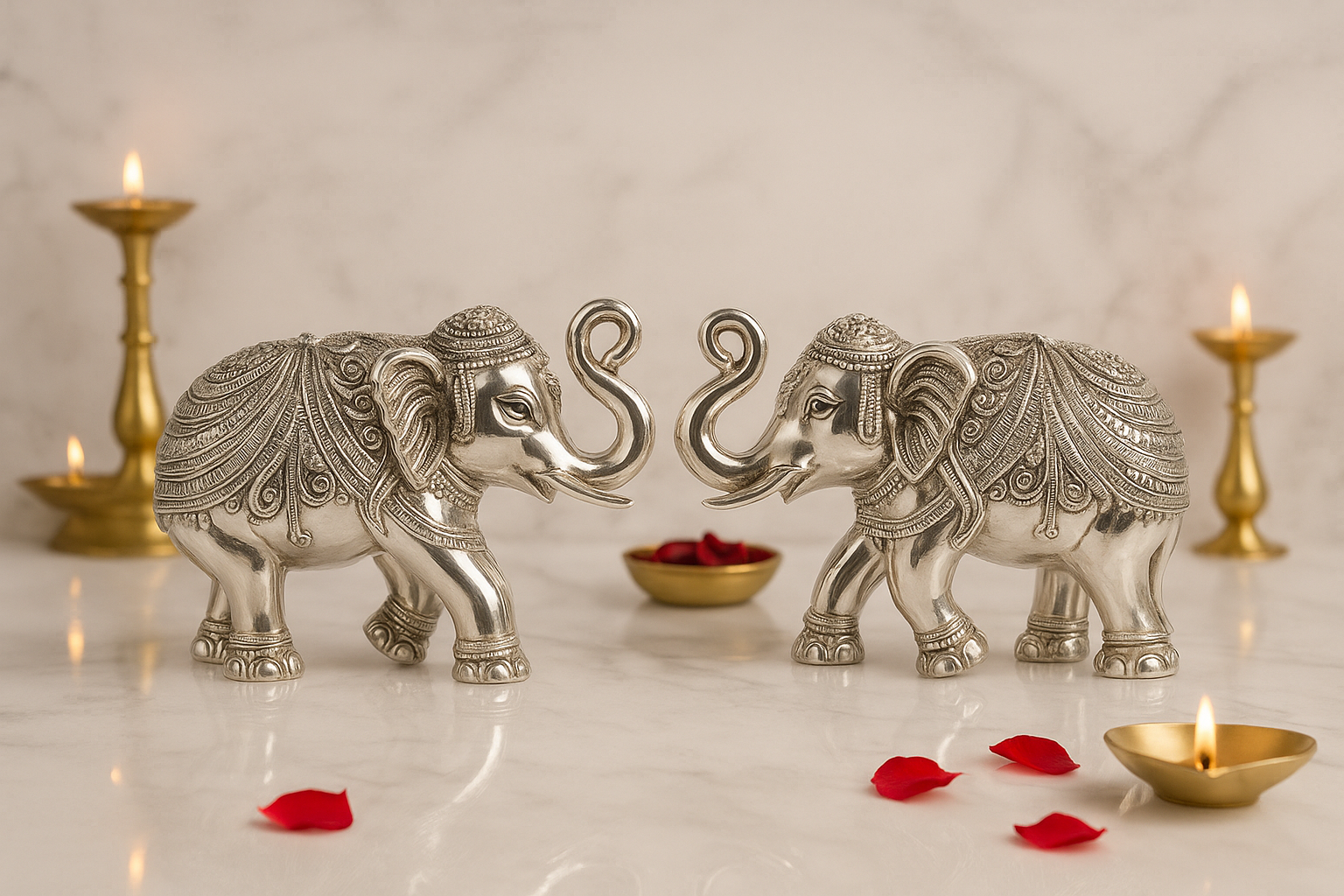 This set features a magnificent pair of decorative elephants crafted with an elegant silver finish, giving them a stately and traditional look. The elephants are stylized, standing on detailed bases, and are richly adorned with intricate engravings across their bodies, saddles, and headpieces, mimicking traditional ceremonial coverings.