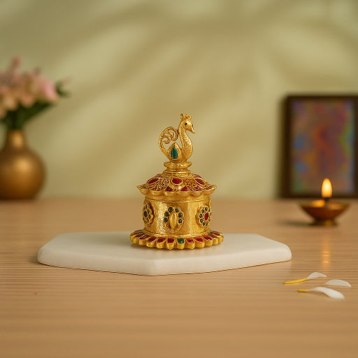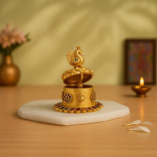 This elegant sindoor dabbi, or kumkum box, is a stunning piece of home decor that beautifully combines traditional Indian craftsmanship with modern design. Perfect for your pooja room, dressing table, or as a thoughtful gift, this handcrafted box adds a touch of sophistication and divine grace to any space.