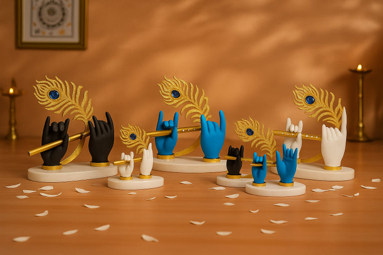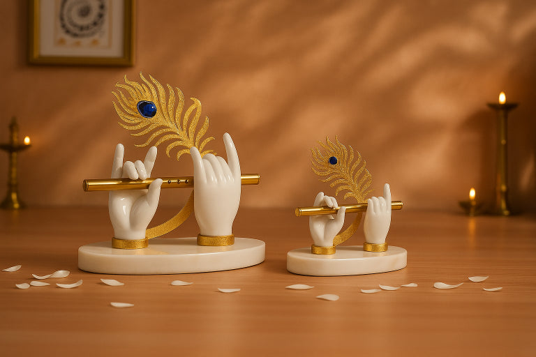 This elegant and modern decorative piece symbolizes Lord Krishna through his flute (Murli) and peacock feather. The idol features a pair of white or cream-colored hands, sculpted delicately to hold the golden flute horizontally. Both wrists are accented with a golden band, matching the flute and the feather.